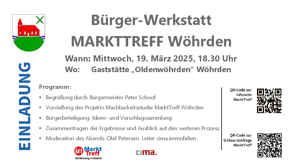 Am 19. März 2025 um 18:30 Uhr findet in der Gaststätte "Oldenwöhrden" eine Bürger-Werkstatt zum Thema MarktTreff statt. Alle Bürgerinnen und Bürger sind herzlich eingeladen, daran teilzunehmen. Die vollständige Einladung finden Sie unten. Ein PDF zum Teilen finden Sie hier.